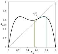 As increases to beyond , the intersection point splits to two, which is a period doubling. For example, when , there are three intersection points, with the middle one unstable, and the two others stable.