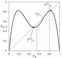 we have a function , and we want to study what happens when we iterate the map many times. The map might fall into a fixed point, a fixed cycle, or chaos. When the map falls into a stable fixed cycle of length , we would find that the graph of and the graph of intersects at points, and the slope of the graph of is bounded in at those intersections.