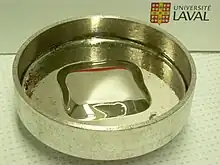 A ferrofluid mirror is a type of deformable mirror with a reflective liquid surface, commonly used in adaptive optics. It is made of ferrofluid and magnetic iron particles in ethylene glycol, the basis of automotive antifreeze.[1] The ferrofluid mirror changes shape instantly when a magnetic field is applied. As the ferromagnetic particles align with the magnetic field, the liquid becomes magnetized and its surface acquires a shape governed by the equilibrium between the magnetic, gravitational and surface tension forces.[2] Since any shapes can be produced by changing the magnetic field geometries, wavefront control and correction can be achieved.