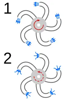 Differences in the regions over which internal and external forces act constitute a force-couple with different moment arms consistent with reverse rotation. ... the resulting flow-field asymmetry developed downstream from the sprinkler-arm bends supports the role of vortices in reverse sprinkler rotation by suggesting a mechanism for generating vortices in a consistent direction.[13]