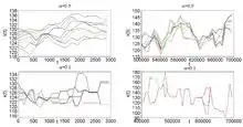 In Figure 1 we show trajectories from 9 particles in a file of 501 particles. (It is recommended opening the file in a new window). The upper panels show trajectories for and the lower panels show trajectories for . For each value of shown are trajectories in the early stages of the simulations (left) and in all stages of the simulation (right). The panels exhibit the phenomenon of the clustering, where the trajectories attract each other and then move pretty much together.