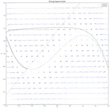 - If the separatrix is a cycle around the left intersection, then trajectories inside the separatrix converge to the left spiral point. Trajectories outside the separatrix converge to the right sink. The separatrix itself is the limit cycle of the lower branch of the stable manifold for the saddle point in the middle. Similarly for the case where the separatrix is a cycle around the right intersection.