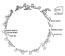 Donald Kerst, working with Symon, filed a patent for the spiral-sector FFA accelerator at around the same time as Symon's Radial Sector patent.[9] A very small spiral sector machine was built in 1957, and a 50 MeV radial sector machine was operated in 1961. This last machine was based on Ohkawa's patent, filed in 1957, for a symmetrical machine able to simultaneously accelerate identical particles in both clockwise and counterclockwise beams.[10] This was one of the first colliding beam accelerators, although this feature was not used when it was put to practical use as the injector for the Tantalus storage ring at what would become the Synchrotron Radiation Center.[11] The 50MeV machine was finally retired in the early 1970s.[12]