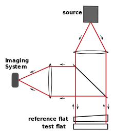 Fizeau interferometers are commonly used for measuring the shape of an optical surface: Typically, a fabricated lens or mirror is compared to a reference piece having the desired shape. In Fig. 1, the Fizeau interferometer is shown as it might be set up to test an optical flat. A precisely figured reference flat is placed on top of the flat being tested, separated by narrow spacers. The reference flat is slightly beveled (only a fraction of a degree of beveling is necessary) to prevent the rear surface of the flat from producing interference fringes. A collimated beam of monochromatic light illuminates the two flats, and a beam splitter allows the fringes to be viewed on-axis.[2][3]
