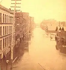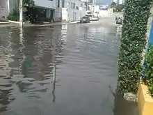 A flood is an overflow of water (or rarely other fluids) that submerges land that is usually dry.[1] In the sense of "flowing water", the word may also be applied to the inflow of the tide. Floods are of significant concern in agriculture, civil engineering and public health. Human changes to the environment often increase the intensity and frequency of flooding. Examples for human changes are land use changes such as deforestation and removal of wetlands, changes in waterway course or flood controls such as with levees. Global environmental issues also influence causes of floods, namely climate change which causes an intensification of the water cycle and sea level rise.[2]: 1517 For example, climate change makes extreme weather events more frequent and stronger.[3] This leads to more intense floods and increased flood risk.[4][5]