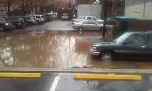 Extreme flood events often result from coincidence such as unusually intense, warm rainfall melting heavy snow pack, producing channel obstructions from floating ice, and releasing small impoundments like beaver dams.[29] Coincident events may cause extensive flooding to be more frequent than anticipated from simplistic statistical prediction models considering only precipitation runoff flowing within unobstructed drainage channels.[30] Debris modification of channel geometry is common when heavy flows move uprooted woody vegetation and flood-damaged structures and vehicles, including boats and railway equipment. Recent field measurements during the 2010–11 Queensland floods showed that any criterion solely based upon the flow velocity, water depth or specific momentum cannot account for the hazards caused by velocity and water depth fluctuations.[31] These considerations ignore further the risks associated with large debris entrained by the flow motion.[32]