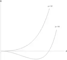 Polymers can separate out from the solvent, and do so in a characteristic way.[4] The Flory-Huggins free energy per unit volume, for a polymer with monomers, can be written in a simple dimensionless form