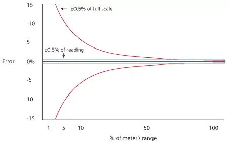 In flow measurement, flow meter error is typically reported by a percentage indicating non-linearity of the device. This can be expressed as either a +/- percentage based on either the full range capacity of the device or as a percentage of the actual indicated flow.[1] In practice the flow meter error is a combination of repeatability, accuracy and the uncertainty of the reference calibration.[2]