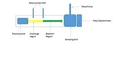 Over the years many variations of the instrument have been made. In the beginning during the 1960s there was the study of flowing afterglow plasma. This study was done by Eldon Ferguson, Art Schmeltekopf and Fred Fehsenfeld at National Bureau of Standards in Boulder, Colorado.[2] Then in the 1970s it was flowing drift tube, flowing afterglow Langmuir probe (FALP), and variable temperature flowing afterglow Langmuir probe (VT-FLAP). With the addition of the drift tube the kinetics of a reaction could be studied in the gas phase.[3] With the flowing afterglow Langmuir probe the electron density within the reaction region of the drift tube can be studied.[3] With the VT-FLAP version of flowing afterglow the reactions temperature dependence could be studied.[3] Now in the 2000s the ambient version of flowing afterglow mass spectrometry is flowing atmospheric pressure afterglow mass spectrometry (FAPA-MS).The FAPA allows for simple or no sample preparations but the humidity of the instrument's environment may have an effect on a sample fragmentation pattern.[4][5] Since the cost of helium is steady rising some have started to use alternative methods with ambient flowing afterglow to conserve resources. Instead of using continuously flowing afterglow helium some use interrupted helium flow to conserve gas and Schlieren imaging to maximize the molecular ions produced and the instrument step-up.[6][7]