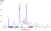 | Spectrum of a "blacklight" lamp | ![]() | There is typically only one phosphor present in a blacklight lamp, usually consisting of europium-doped strontium fluoroborate, which is contained in an envelope of Wood's glass. |