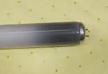 A fluorescent lamp tube is filled with a mix of argon, xenon, neon, or krypton, and mercury vapor. The pressure inside the lamp is around 0.3% of atmospheric pressure.[27] The partial pressure of the mercury vapor alone is about 0.8 Pa (8 millionths of atmospheric pressure), in a T12 40-watt lamp.[28] The inner surface of the lamp is coated with a fluorescent coating made of varying blends of metallic and rare-earth phosphor salts. The lamp's electrodes are typically made of coiled tungsten and are coated with a mixture of barium, strontium and calcium oxides to improve thermionic emission.