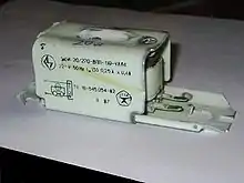 Electronic starters use a different method to preheat the cathodes.[37] They may be plug-in interchangeable with glow starters. They use a semiconductor switch and "soft start" the lamp by preheating the cathodes before applying a starting pulse which strikes the lamp first time without flickering; this dislodges a minimal amount of material from the cathodes during starting, giving longer lamp life.[36] This is claimed to prolong lamp life by a factor of typically 3 to 4 times for a lamp frequently switched on as in domestic use,[38] and to reduce the blackening of the ends of the lamp typical of fluorescent tubes. While the circuit is complex, the complexity is built into an integrated circuit chip. Electronic starters may be optimized for fast starting (typical start time of 0.3 seconds),[38][39] or for most reliable starting even at low temperatures and with low supply voltages, with a startup time of 2–4 seconds.[40] The faster-start units may produce audible noise during start-up.[41]