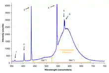 | Typical fluorescent lamp with rare-earth phosphor | ![]() | A typical "cool white" fluorescent lamp utilizing two rare-earth-doped phosphors, Tb3+, Ce3+:LaPO4 for green and blue emission and Eu:Y2O3 for red. For an explanation of the origin of the individual peaks click on the image. Several of the spectral peaks are directly generated from the mercury arc. This is likely the most common type of fluorescent lamp in use today. |