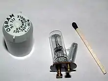 Before the 1960s, four-pin thermal starters and manual switches were used. A glow switch starter automatically preheats the lamp cathodes. It consists of a normally open bi-metallic switch in a small sealed gas-discharge lamp containing inert gas (neon or argon). The glow switch will cyclically warm the filaments and initiate a pulse voltage to strike the arc; the process repeats until the lamp is lit. Once the tube strikes, the impinging main discharge keeps the cathodes hot, permitting continued electron emission. The starter switch does not close again because the voltage across the lit tube is insufficient to start a glow discharge in the starter.[36]
