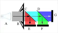 The parts of a flying spot scanner: (A) Cathode-ray tube (CRT); (B) photon beam; (C) & (D) dichroic mirrors; (E), (F) & (G) red-, green- and blue-sensitive photomultipliers.