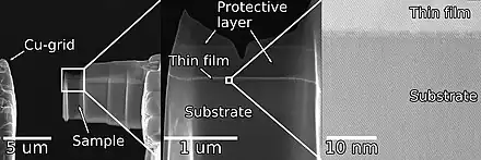 The FIB is also commonly used to prepare samples for the transmission electron microscope. The TEM requires very thin samples, typically ~100 nanometers or less. Other techniques, such as ion milling or electropolishing can be used to prepare such thin samples. However, the nanometer-scale resolution of the FIB allows the exact region of interest to be chosen, such as perhaps a grain boundary or defect in a material. This is vital, for example, in integrated circuit failure analysis. If a particular transistor out of several million on a chip is bad, the only tool capable of preparing an electron microscope sample of that single transistor is the FIB.[8][9] The same protocol used for preparing samples to transmission electron microscopy can also be used to select a micro area of a sample, extract it and prepare it for analysis using a Secondary ion mass spectrometry (SIMS).[11]