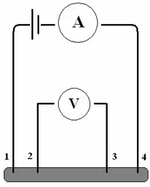 Four-point measurement of resistance between voltage sense connections 2 and 3. Current is supplied via force connections 1 and 4.