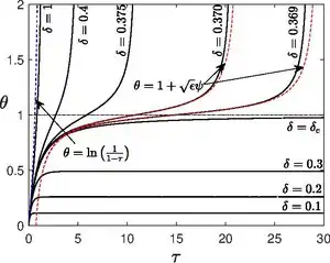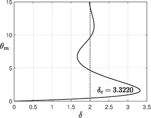 The above equation is nothing but Emden–Chandrasekhar equation,[16] which appears in astrophysics describing isothermal gas sphere. Unlike planar and cylindrical case, the spherical vessel has infinitely many solutions for oscillating about the point ,[17] instead of just two solutions, which was shown by Israel Gelfand.[18] The lowest branch will be chosen to explain explosive behavior.