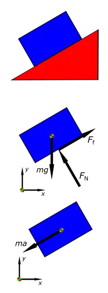 A simple free-body diagram, shown above, of a block on a ramp, illustrates this.