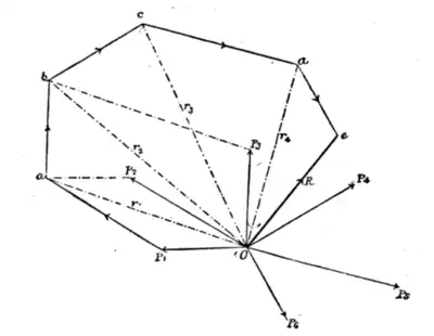 To graphically determine the resultant force of multiple forces, the acting forces can be arranged as edges of a polygon by attaching the beginning of one force vector to the end of another in an arbitrary order. Then the vector value of the resultant force would be determined by the missing edge of the polygon.[2] In the diagram, the forces P1 to P6 are applied to the point O. The polygon is constructed starting with P1 and P2 using the parallelogram of forces (vertex a). The process is repeated (adding P3 yields the vertex b, etc.). The remaining edge of the polygon O-e represents the resultant force R.