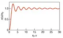 Friedel oscillations,[1] named after French physicist Jacques Friedel, arise from localized perturbations in a metallic or semiconductor system caused by a defect in the Fermi gas or Fermi liquid.[2] Friedel oscillations are a quantum mechanical analog to electric charge screening of charged species in a pool of ions. Whereas electrical charge screening utilizes a point entity treatment to describe the make-up of the ion pool, Friedel oscillations describing fermions in a Fermi fluid or Fermi gas require a quasi-particle or a scattering treatment. Such oscillations depict a characteristic exponential decay in the fermionic density near the perturbation followed by an ongoing sinusoidal decay resembling sinc function. In 2020, magnetic Friedel oscillations were observed on a metal surface.[3][4]