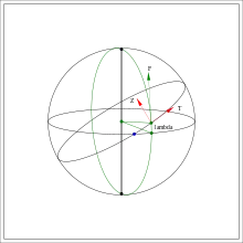 where is the angle between the equator plane and (between the green points of figure 2) and from equation (12) of the article Geopotential model one therefore obtains