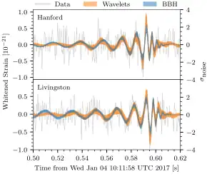 ![]() The signal of GW170104 measured by Hanford and Livingston. | |