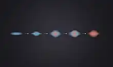 Mergers between such large galaxies are regarded as violent, and the frictional interaction of the gas between the two galaxies can cause gravitational shock waves, which are capable of forming new stars in the new elliptical galaxy.[11] By sequencing several images of different galactic collisions, one can observe the timeline of two spiral galaxies merging into a single elliptical galaxy.[12]