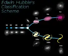 Edwin Hubble created an early galaxy classification scheme, now known as the Hubble tuning-fork diagram. It partitioned galaxies into ellipticals, normal spirals, barred spirals (such as the Milky Way), and irregulars. These galaxy types exhibit the following properties which can be explained by current galaxy evolution theories: