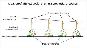 Proportional counters operate at a slightly higher voltage, selected such that discrete avalanches are generated. Each ion pair produces a single avalanche so that an output current pulse is generated which is proportional to the energy deposited by the radiation. This is in the "proportional counting" region.[2] The term "gas proportional detector" (GPD) is generally used in radiometric practice, and the property of being able to detect particle energy is particularly useful when using large area flat arrays for alpha and beta particle detection and discrimination, such as in installed personnel monitoring equipment.
