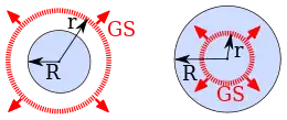 Gauss's law in its integral form is particularly useful when, by symmetry reasons, a closed surface (GS) can be found along which the electric field is uniform. The electric flux is then a simple product of the surface area and the strength of the electric field, and is proportional to the total charge enclosed by the surface. Here, the electric field outside (r > R) and inside (r < R) of a charged sphere is being calculated (see Wikiversity).