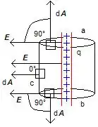 where q is the charge enclosed in the Gaussian surface. There are three surfaces a, b and c as shown in the figure. The differential vector area is dA, on each surface a, b and c.