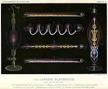 A Geissler tube is a precursor to modern gas discharge tubes, demonstrating the principles of electrical glow discharge, akin to contemporary neon lights, and central to the discovery of the electron.[1]: 67 This device was developed in 1857 by Heinrich Geissler, a German physicist and glassblower. A Geissler tube is composed of a sealed glass cylinder of various shapes, which is partially evacuated and equipped with a metal electrode at each end. It contains rarefied gases—such as neon or argon, air, mercury vapor, or other conductive substances, and sometimes ionizable minerals or metals like sodium. When a high voltage is applied between the electrodes, there is an electric current through the tube, causing gas molecules to ionize by shedding electrons. The free electrons reunite with the ions and the resulting energic atoms emit light via fluorescence, with the emitted color characteristic of the contained material.