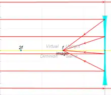 Rays from an object at finite distance are focused further from the lens than the focal distance; the closer the object is to the lens, the further the image is from the lens. With concave lenses, incoming parallel rays diverge after going through the lens, in such a way that they seem to have originated at an upright virtual image one focal length from the lens, on the same side of the lens that the parallel rays are approaching on.