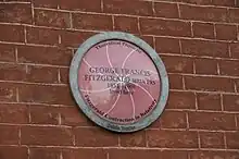FitzGerald was born at No. 19, Lower Mount Street in Dublin on 3 August 1851 to the Reverend William FitzGerald and his wife Anne Frances Stoney (sister of George Johnstone Stoney and Bindon Blood Stoney).[1] Professor of Moral Philosophy in Trinity and vicar of St Anne's, Dawson Street, at the time of his son's birth, William FitzGerald was consecrated Bishop of Cork, Cloyne and Ross in 1857 and translated to Killaloe and Clonfert in 1862. George returned to Dublin and entered TCD as a student at the age of 16, winning a scholarship in 1870 and graduating in 1871 in Mathematics and Experimental Science. He became a Fellow of Trinity in 1877 and spent the rest of his career there, becoming Erasmus Smith's Professor of Natural and Experimental Philosophy in 1881.[2][3]