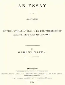George Green (14 July 1793 – 31 May 1841) was a British mathematical physicist who wrote An Essay on the Application of Mathematical Analysis to the Theories of Electricity and Magnetism in 1828.[2][3] The essay introduced several important concepts, among them a theorem similar to the modern Green's theorem, the idea of potential functions as currently used in physics, and the concept of what are now called Green's functions. Green was the first person to create a mathematical theory of electricity and magnetism and his theory formed the foundation for the work of other scientists such as James Clerk Maxwell, William Thomson, and others. His work on potential theory ran parallel to that of Carl Friedrich Gauss.