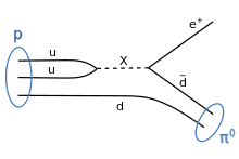 In the lowest-order Feynman diagram corresponding to the simplest source of proton decay in SU(5), a left-handed and a right-handed up quark annihilate yielding an X+ boson which decays to a right-handed (or left-handed) positron and a left-handed (or right-handed) anti-down quark: