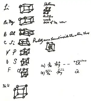 About 1902 Lewis started to use unpublished drawings of cubical atoms in his lecture notes, in which the corners of the cube represented possible electron positions. Lewis later cited these notes in his classic 1916 paper on chemical bonding, as being the first expression of his ideas.