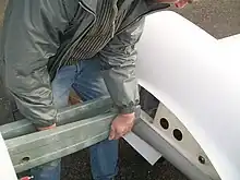 Early glider designs used skids for landing, but modern types generally land on wheels. Some of the earliest gliders used a dolly with wheels for taking off and the dolly was jettisoned as the glider left the ground, leaving just the skid for landing. A glider may be designed so the center of gravity (CG) is behind the main wheel so the glider sits nose high on the ground. Other designs may have the CG forward of the main wheel so the nose rests on a nose-wheel or skid when stopped. Skids are now mainly used only on training gliders such as the Schweizer SGS 2–33. Skids are around 100 millimetres (4 in) wide by 900 mm (3 ft) long and run from the nose to the main wheel. Skids help with braking after landing by allowing the pilot to put forward pressure on the control stick, thus creating friction between the skid and the ground. The wing tips also have small skids or wheels to protect the wing tips from ground contact.