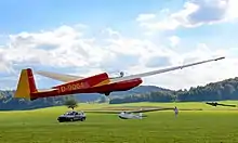 A glider or sailplane is a type of glider aircraft used in the leisure activity and sport of gliding (also called soaring).[1][2] This unpowered aircraft can use naturally occurring currents of rising air in the atmosphere to gain altitude. Sailplanes are aerodynamically streamlined and so can fly a significant distance forward for a small decrease in altitude.