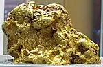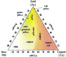 Whereas most metals are gray or silvery white, gold is slightly reddish-yellow.[23] This color is determined by the frequency of plasma oscillations among the metal's valence electrons, in the ultraviolet range for most metals but in the visible range for gold due to relativistic effects affecting the orbitals around gold atoms.[24][25] Similar effects impart a golden hue to metallic caesium.