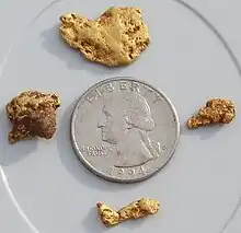 Gold often occurs in free elemental (native state), as nuggets or grains, in rocks, veins, and alluvial deposits. It occurs in a solid solution series with the native element silver (as in electrum), naturally alloyed with other metals like copper and palladium, and mineral inclusions such as within pyrite. Less commonly, it occurs in minerals as gold compounds, often with tellurium (gold tellurides).