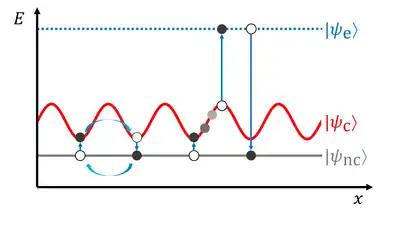 The net effect of many cycles from bright to excited to dark states is to subject atoms to Sisyphus-like cooling in the bright state and select the coldest atoms to enter the dark state and escape the cycle. The latter process constitutes velocity-selective coherent population trapping (VSCPT).[5] The combination of bright and dark states thus inspires the name "gray molasses."