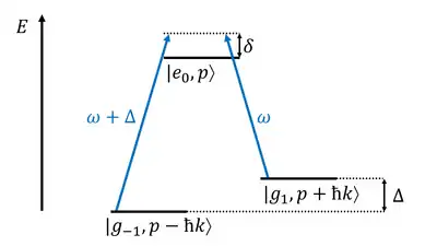 Denote the two ground states and the excited state of the electron and , respectively. The atom also has overall momentum, so the overall state of the atom is a product state of its internal state and its momentum, as shown in the figure. In the presence of counter-propagating beams of opposite polarization, the internal states experience the atom-light interaction Hamiltonian
