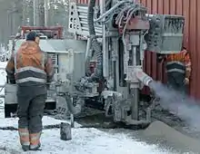 A vertical system consists of a number of boreholes some 50 to 400 feet (15–122 m) deep fitted with U-shaped pipes through which a heat-carrying fluid that absorbs (or discharges) heat from (or to) the ground is circulated.[12][13] Bore holes are spaced at least 5–6 m apart and the depth depends on ground and building characteristics. Alternatively, pipes may be integrated with the foundation piles used to support the building. Vertical systems rely on migration of heat from surrounding geology, unless recharged during the summer and at other times when surplus heat is available. Vertical systems are typically used where there is insufficient available land for a horizontal system.