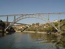 The bridge over the Douro came about as the result of a competition held by the Royal Portuguese Railroad Company. The task was a demanding one: the river was fast-flowing, up to 20 m (66 ft) deep, and had a bed formed of a deep layer of gravel which made the construction of piers on the river bed impossible, and so the bridge had to have a central span of 160 m (520 ft). This was greater than the longest arch span which had been built at the time.[17] Eiffel's proposal was for a bridge whose deck was supported by five iron piers, with the abutments of the pair on the river bank also bearing a central supporting arch. The price quoted by Eiffel was FF.965,000, far below the nearest competitor and so he was given the job, although since his company was less experienced than his rivals the Portuguese authorities appointed a committee to report on Eiffel et Cie's suitability. The members included Jean-Baptiste Krantz, Henri Dion and Léon Molinos, both of whom had known Eiffel for a long time: their report was favorable, and Eiffel got the job. On-site work began in January 1876 and was complete by the end of October 1877: the bridge was ceremonially opened by King Luís I and Queen Maria Pia, after whom the bridge was named, on 4 November.
