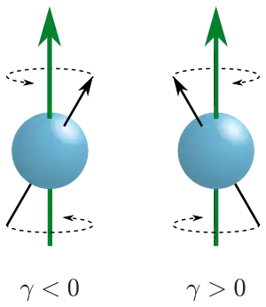 The sign of the gyromagnetic ratio, γ, determines the sense of precession. While the magnetic moments (the black arrows) are oriented the same for both cases of γ, the precession is in opposite directions. Spin and magnetic moment are in the same direction for γ > 0 (as for protons).