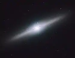 The object was first observed in November 2004, in which it was seen as a source emitting X-rays in the outskirts of the spiral galaxy ESO 243-49 and was catalogued as 2XMM J011028.1-460421, but nicknamed "HLX-1".[5] In 2008, a team of astronomers led by Natalie Webb at the Institut de Recherche en Astrophysique et Planétologie in Toulouse, France, discovered HLX-1 and from the very high X-ray luminosity (~1 x 1042 erg s−1, 0.2-10.0 keV), as well as its X-ray characteristics, proposed that it was an intermediate mass black hole candidate.[2] Follow up analysis using further X-ray,[6][7][8][9][10] optical [11][12] and radio [13] observations support the intermediate-mass black hole nature. In 2012, further work showed that there was a small cluster of stars amassed around HLX-1, leading Sean Farrell and collaborators[11] to conclude that the black hole was once the galactic center of a dwarf galaxy, which was consumed by ESO 243-49.[14][15] Farrell remarked, "The fact that there's a very young cluster of stars indicates that the intermediate-mass black hole may have originated as the central black hole in a very low-mass dwarf galaxy. The dwarf galaxy was then swallowed by the more massive galaxy.".[16]