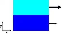 Two fluids moving past each other in the x direction. The liquid on top is moving faster and will be pulled in the negative direction by the bottom liquid while the bottom liquid will be pulled in the positive direction by the top liquid.