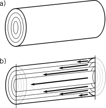 a) A tube showing the imaginary lamina. b) A cross section of the tube shows the lamina moving at different speeds. Those closest to the edge of the tube are moving slowly while those near the center are moving quickly.